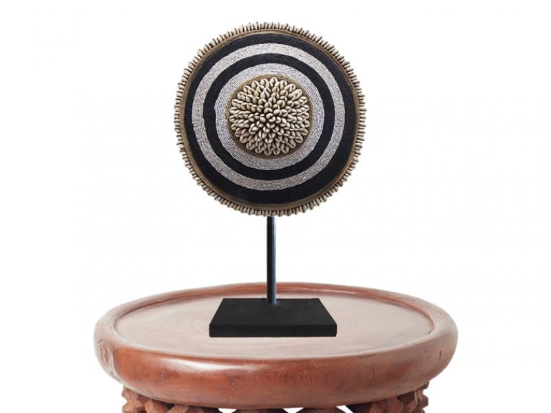 Traditionally these shields were used as defensive weapons and also as decorative or ritual objects, which in Cameroon symbolise status and wealth. Hand carved from one piece of wood and decorated by large groups of locals making up the Tikar Tribe makes each shield a unique piece. The shields are adorned with a combination of beads, cowrie shells and manilla string.